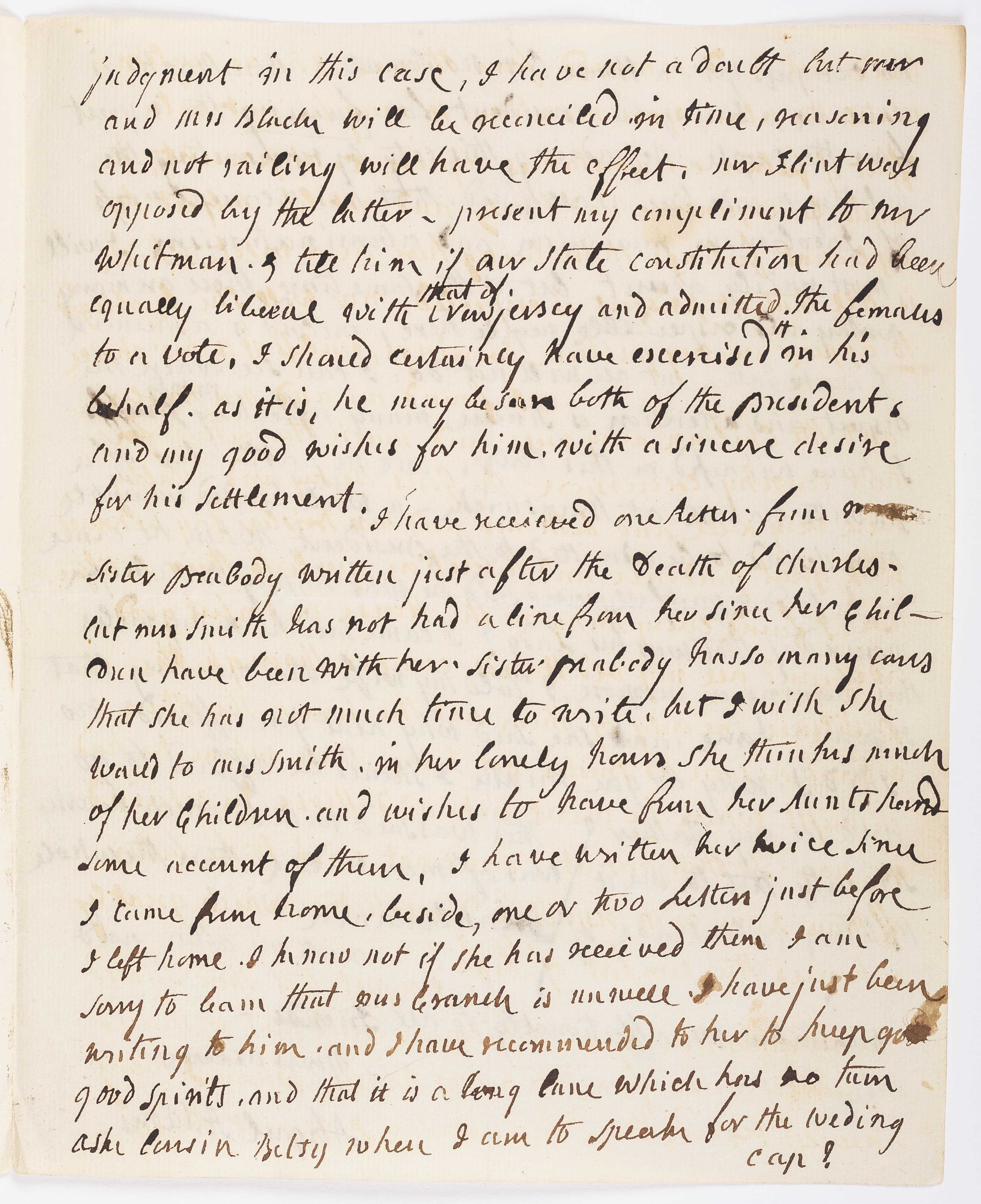Abigail Adams to Mary Cranch, November 15, 1797Women across the nation, and perhaps even the Atlantic, drew inspiration from the New Jersey “exception” and its early women voters. In 1797, Abigail Adams wrote a letter to her sister supporting women’s suffrage in New Jersey.